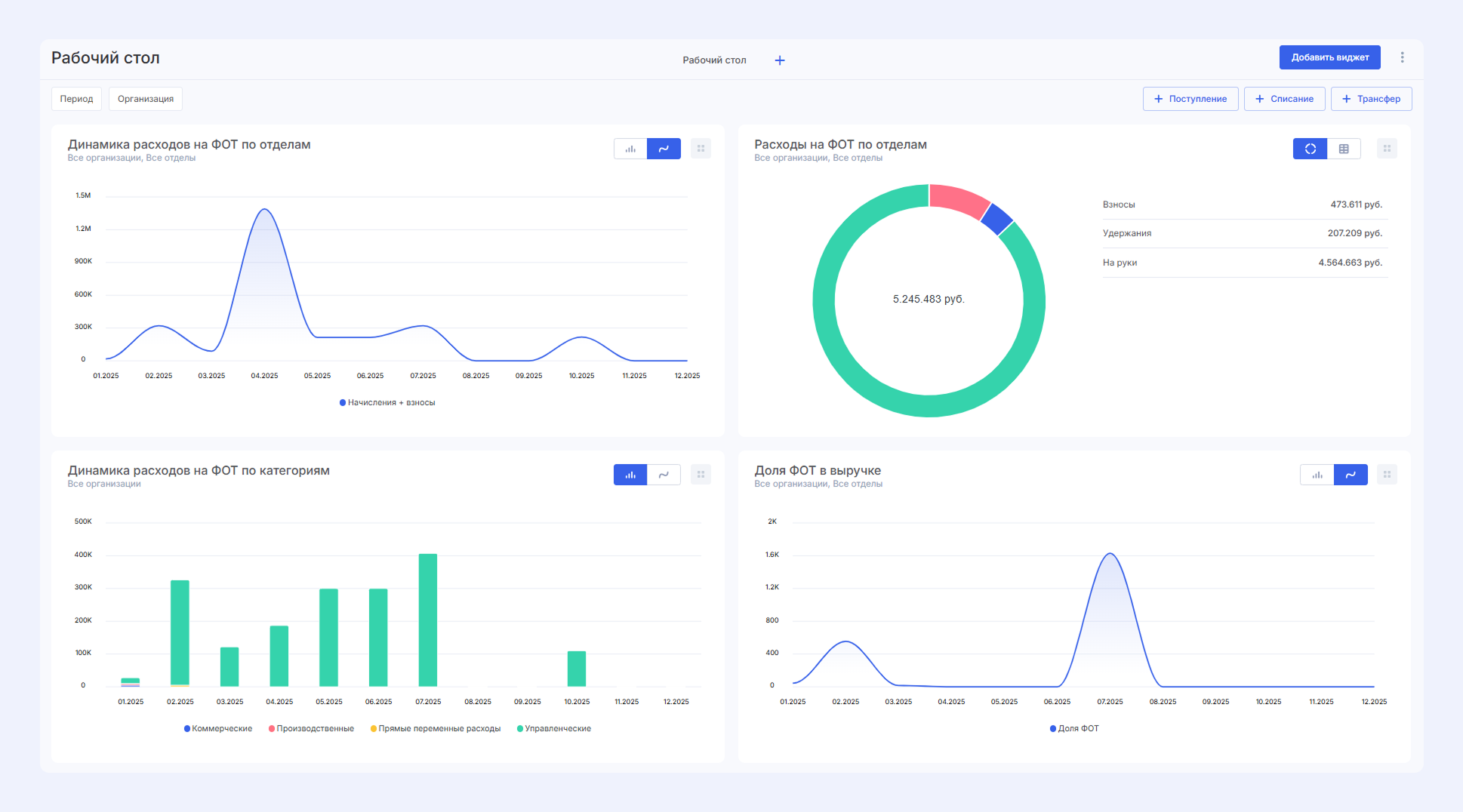 Вместе с модулем пользователям доступен набор виджетов для более глубокой аналитики расходов на ФОТ — как в разрезе отделов, так и конкретных сотрудников.