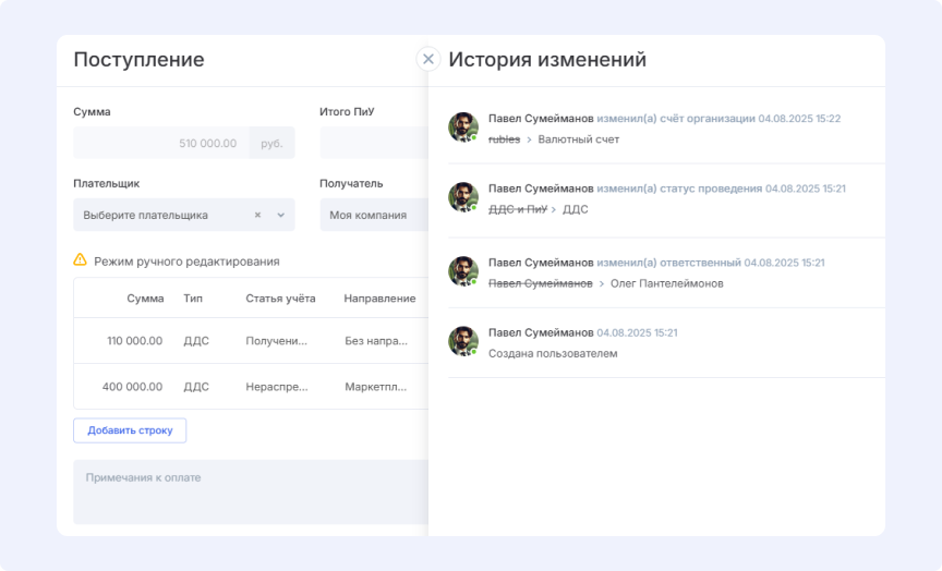 Все изменения в платежах логируются — администратору доступна информация обо всех правках: от времени их создания и смены статуса до редактуры названия и суммы, а также авторов этих изменений.