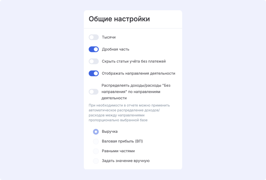 В отчете ПиУ появилась возможность распределять косвенные расходы и доходы без направлений деятельности. В системе доступны разные методы распределения.