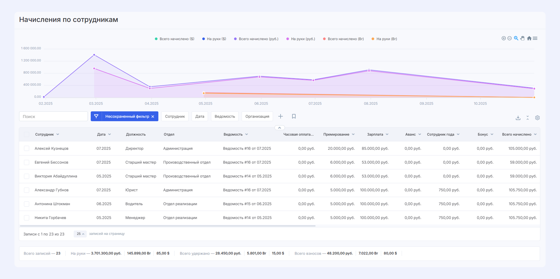 - вести список сотрудников и начислений по ним — с помощью импорта из 1С;