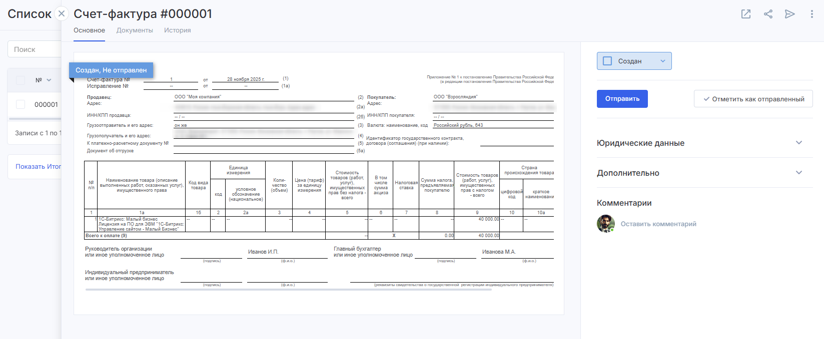 Система сама проверяет заполнение реквизитов, а данные подписанта подставляются автоматически. Так вы сэкономите время и сможете сразу выгрузить документ для отправки через ЭДО клиенту или в налоговую.