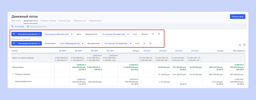 В отчетах ДДС и ПиУ стало возможным сравнивать периоды — по месяцам, кварталам и годам. Вам это поможет:
